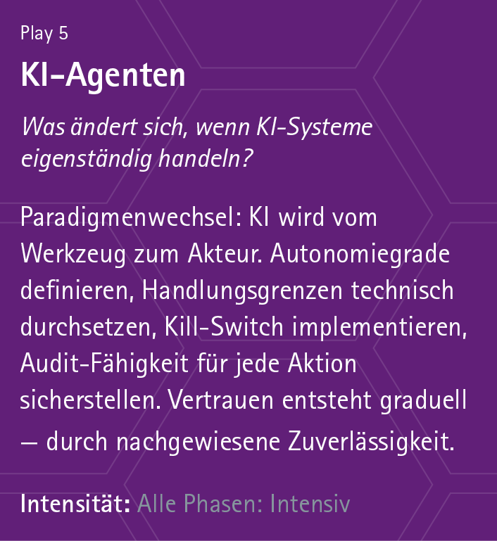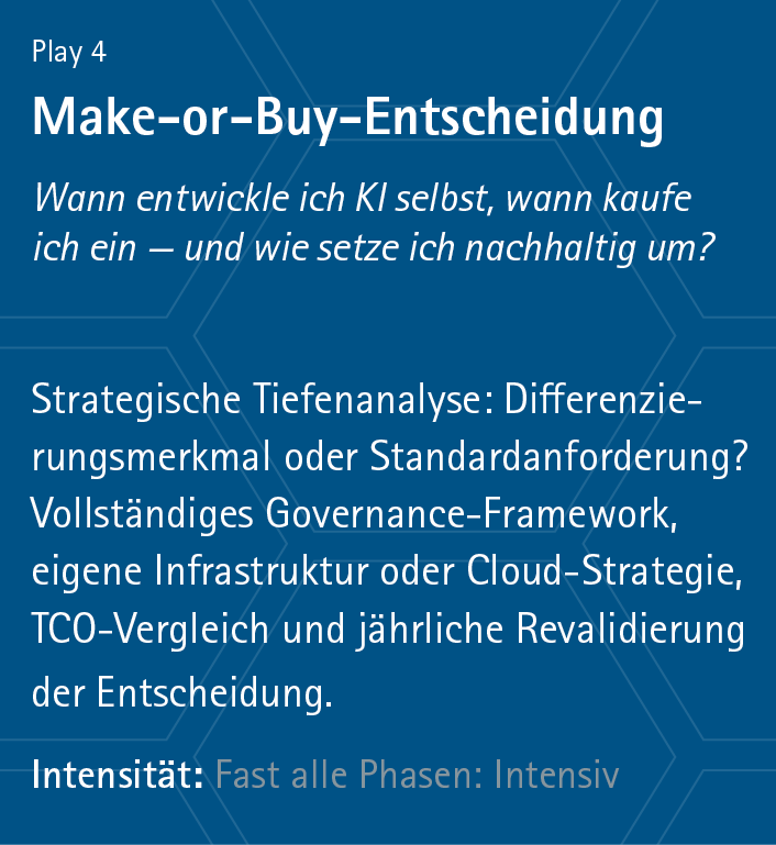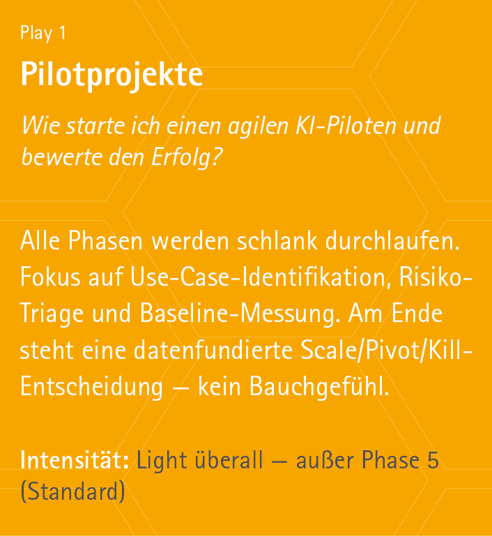 - Lock-in von Anfang an vermeiden. Der KI-Markt bewegt sich schnell. Wer heute in proprietäre Abhängigkeiten investiert, bezahlt morgen für den Wechsel. Das Playbook adressiert das in jeder Phase explizit.