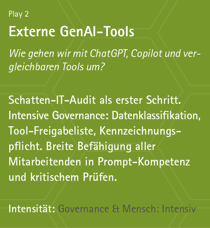 Hinzu kommt: Unternehmen starten einen Piloten, führen ein externes Tool ein oder entscheiden über Eigenentwicklung versus Einkauf. Jedes Szenario stellt andere Anforderungen an Governance, Technologie und Kompetenz.