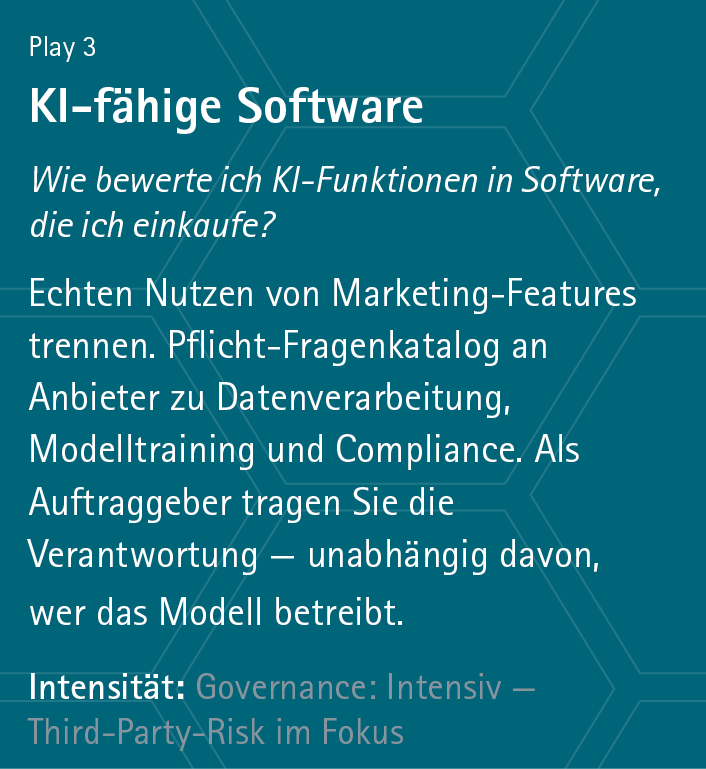 Künstliche Intelligenz steht in nahezu allen Unternehmen auf der Prioritätenliste. Gleichzeitig zeigt sich ein wiederkehrendes Bild: Einzelne Teams experimentieren mit generativen KI-Tools, Fachbereiche fordern KI-Funktionen in ihrer Software, und die IT steht vor der Aufgabe, Governance und Infrastruktur nachzuziehen. Jede Initiative für sich ist nachvollziehbar — zusammen ergeben sie noch kein Bild. Wer das Whitepaper "Potenziale von KI sicher nutzen" gelesen hat, kennt den strategischen Rahmen: die 3-Säulen-Strategie aus Governance, IT-Sicherheit und menschlicher Kompetenz. Wie genau dieser Rahmen nun auf konkrete Anwendungsfälle angewendet wird, erklärt das Playbook.